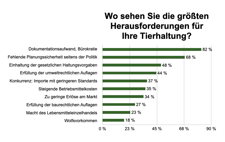 Obwohl nahezu alle Teilnehmer Freude an der Tätigkeit als Landwirt (95 %) und am Umgang mit Tieren (99 %) haben, würde sich ein knappes Fünftel (17 %) nicht wieder für den Beruf als Landwirt entscheiden. Dies lässt sich auf die zahlreichen Herausforderungen zurückführen, denen sich Tierhalter in ihrem beruflichen Alltag gegenübergestellt sehen. So sagen 94 % der Teilnehmer, dass sie aufgrund der Dokumentationspflichten zu viel Zeit am Schreibtisch verbringen. Dies spiegelt sich auch in den zehn am häufigsten genannten Herausforderungen wider, die Abbildung 2 auflistet. Bei allen Tierarten, außer bei den Haltern von kleinen Wiederkäuern, liegen der Dokumentationsaufwand und die Bürokratie sowie die fehlende Planungssicherheit auf den ersten beiden Plätzen. Unter den Schaf- und Ziegenhaltern wird der Wolf von mehr als dreiviertel (77 %) der Teilnehmer als Problem erachtet und sogar häufiger angeführt als der Dokumentationsaufwand und die Bürokratie.