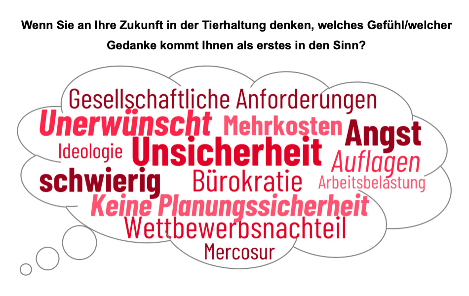 Die Gedanken und Gefühle der Teilnehmer hinsichtlich ihrer Zukunft in der Tierhaltung sind stark negativ geprägt (s. Abbildung 3). Beim Blick in die Zukunft überwiegt Unsicherheit, oftmals ist auch Angst vorhanden. Die Tierhalter haben das Gefühl von der Politik, die zum Teil als ideologiegetrieben bezeichnet wird, unerwünscht zu sein. Aufgrund der Belastungen durch Auflagen und Bürokratie kommt es zu Mehrkosten und Wettbewerbsnachteilen gegenüber Erzeugern im (europäischen) Ausland. Die fehlende Planungssicherheit seitens der Politik und die steigenden gesellschaftlichen Anforderungen erschweren die Zukunftsaussichten. Hinzu kommt die eigene Arbeitsbelastung, der Fachkräftemangel oder die fehlende Finanzierbarkeit von Fremdarbeitskräften.