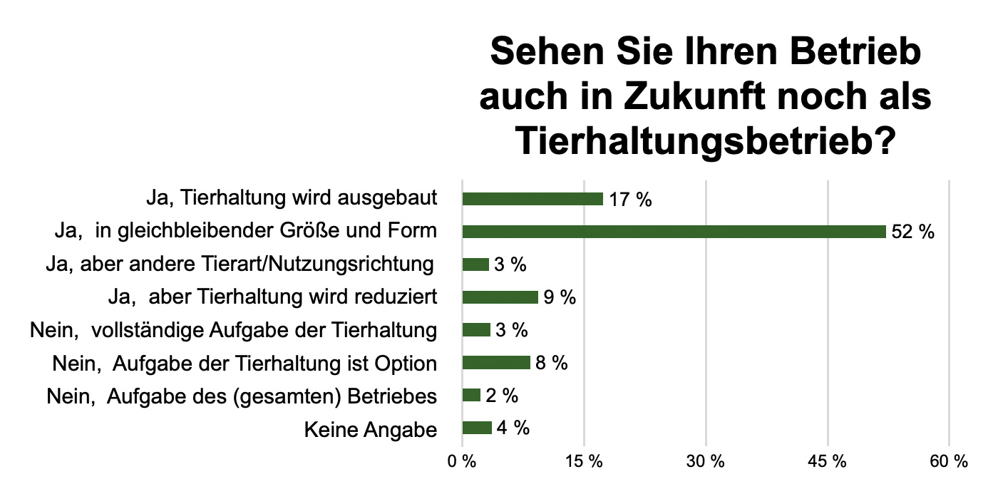 Betriebe, die ihre Tierhaltung aufgeben wollen, geben größtenteils an, dies in den nächsten zwei bis fünf Jahren zu tun (38 %). Jeweils rund 30 % wollen die Tierhaltung in den nächsten zwei Jahren oder in fünf bis zehn Jahren beenden. Dabei gibt je knapp über die Hälfte an, dass der gesamte Betrieb länger bewirtschaftet werden wird. Somit wird bei weniger als der Hälfte der Befragten zeitgleich mit dem Ausstieg aus der Tierhaltung der gesamte Betrieb aufgegeben.
