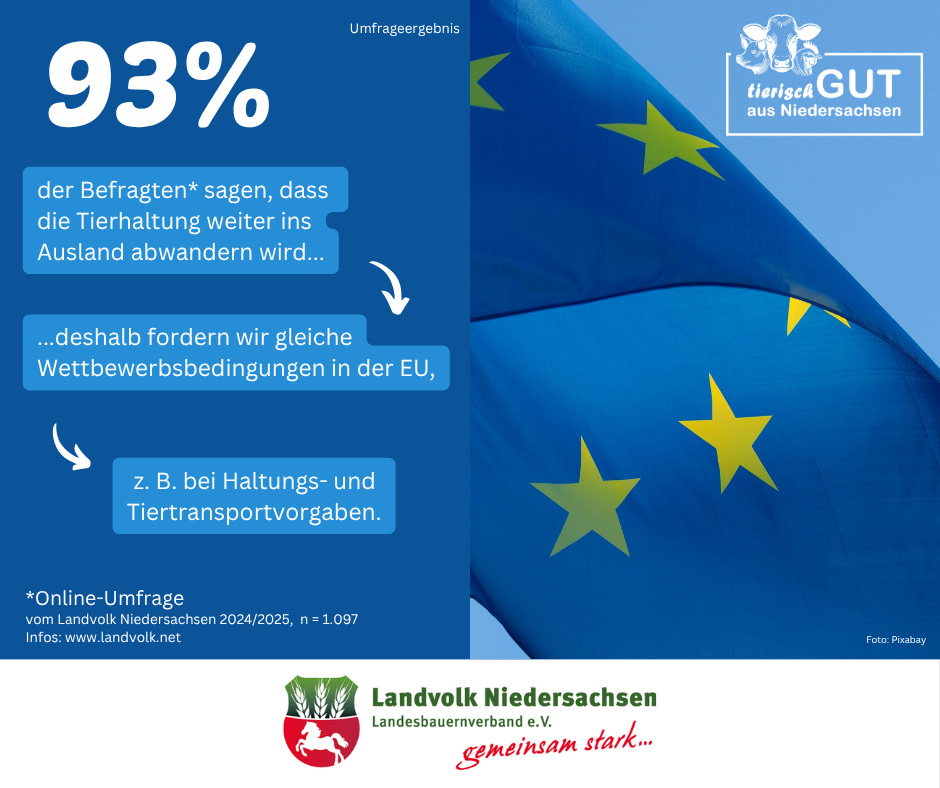 „Die Tierhaltung hat für die niedersächsische Landwirtschaft enorme Bedeutung – mehr als die Hälfte unserer Wertschöpfung entsteht in diesem Bereich. Daher ist sie ein zentrales Schwerpunktthema unserer Verbandsarbeit. Wir fordern ein Moratorium der Auflagen, die 1:1-Umsetzung von EU-Vorgaben ohne zusätzlichen deutschen ‚Goldstandard‘ und langfristige Planungssicherheit für Investitionen in unsere Betriebe.“